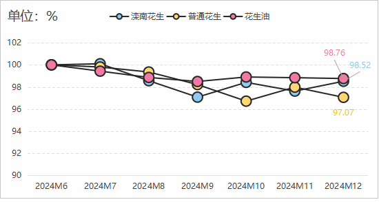 分项产物价钱指数方面,三大分项指数呈现“一涨一平一跌”,此中滦南花生价钱指数呈现小幅回升,12月指数值为98。52点,环比增加0。91%;花生油价钱指数连结平稳运转,指数值为98。76点;通俗花生价钱指数小幅下滑,12月指数值环比下降0。94%至97。07点。分项指数具体走势见下图。